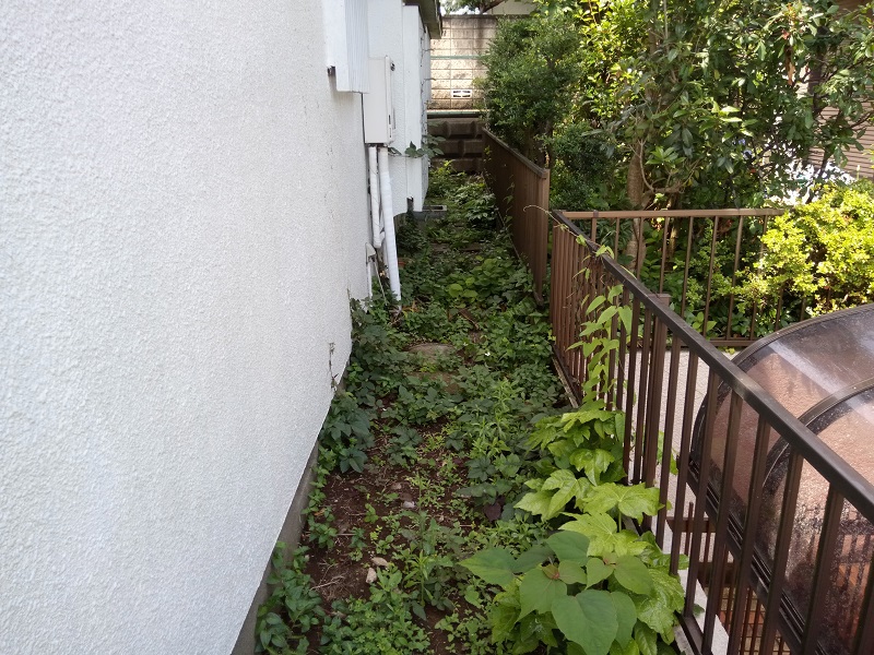 埼玉県春日部市の庭の横から玄関までの雑草の草取り、草むしりでした。ネット検索で何件かお電話していたが、お日にちも時間もあわずにいたが、近場で対応してくれたのがこちらなのでお願いしました。との事でした。